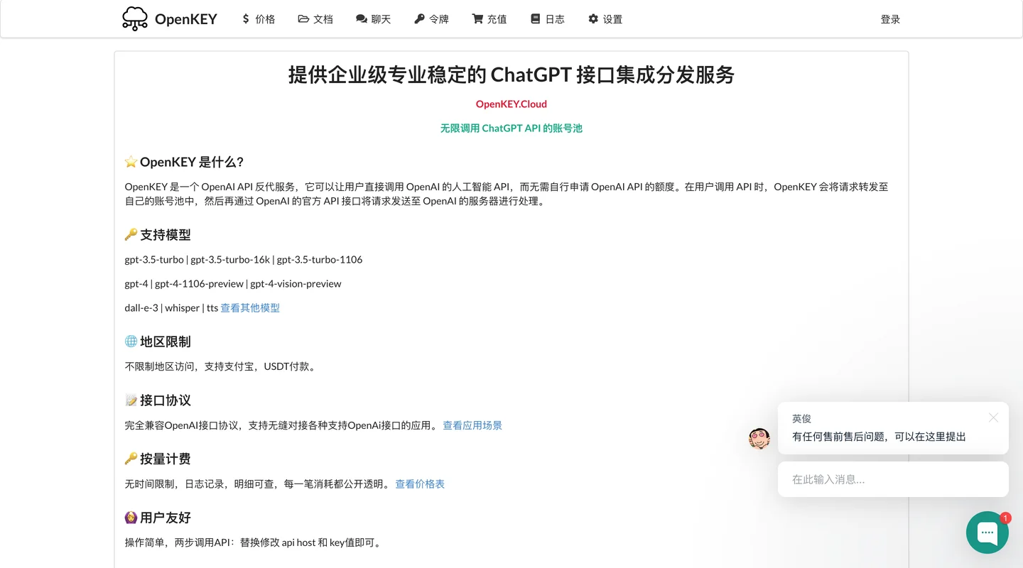 OpenKEY 是一个 OpenAI API 反代服务,它可以让用户直接调用 OpenAI 的人工智能 API,而无需自行申请 OpenAI API 的额度。在用户调用 API 时,OpenKEY 会将请求转发至自己的账号池中,然后再通过 OpenAI 的官方 API 接口将请求发送至 OpenAI 的服务器进行处理。