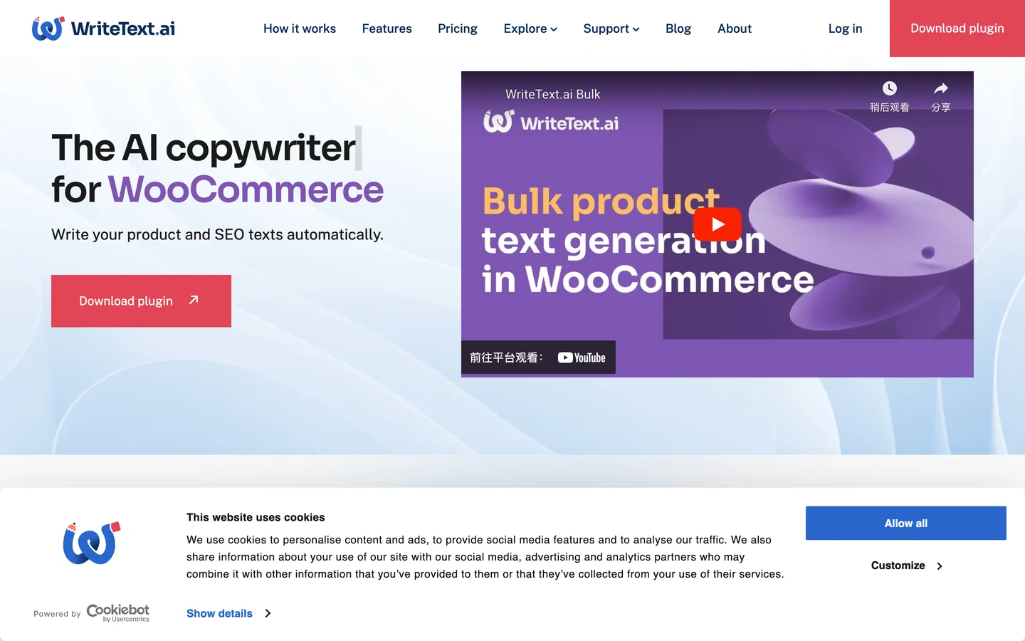 WooCommerce 的 WriteText.ai WriteText.ai 是专门为 WordPress/WooCommerce 设计的独特插件,旨在自动生成产品文本和元描述。 这个强大的工具可以灵活地为单个产品和批量多个产品创建文本,与 WordPress/WooCommerce 无缝集成,提供直观的用户体验。 WriteText.ai 的突出特点是能够制作高质量、SEO 友好的元标题、元描述、产品描述和开放图谱文本。 其“WriteText.ai Single”和“WriteText.ai Bulk”模式优化了内容生成效率。 使用WriteText.ai,用户可以在每个帐户下享受无限的用户和网上商店安装,没有任何限制。 WriteText.ai Single:除了选择语气、风格和目标市场的能力之外,作家现在还通过 WriteText.ai 增强了功能。 他们可以进行彻底的关键字分析,选择语义关键字,并直接从 WooCommerce 选择属性以包含在生成的文本中。 这些功能使作者能够更好地控制最终输出。 在完成必要的产品熟悉和关键词分析后,WriteText.ai 在短短 50 秒左右的时间内迅速生成实际文本。 这种高效的流程使作者能够在将输出发布到 WooCommerce 之前及时审查输出,确保其准确性并符合他们的意图。 借助 WriteText.ai Single,作者可以在整个内容中保持语气和风格的一致性,同时还可以集成相关关键字以提高 SEO 排名。 该插件的灵活性使得可以对每个产品进行定制,从而在最终发布之前满足目标受众的特定需求和偏好。 WriteText.ai Bulk:此外,当同时为多个产品生成文本时,WriteText.ai 提供了方便的批量功能,可以简化流程。 通过此功能,作者可以选择多个产品并同时为它们生成文本。 尽管在此模式下无法进行关键字分析、语义关键字选择和单独属性定制(因为文本是集体生成的),但作者仍然能够为所有选定的产品设置一致的基调、风格和属性。 WriteText.ai 批量模式旨在高效且节省时间。 一旦设置了产品和所需的基调、风格和属性,只需大约 30 秒即可为每个产品生成文本。 当需要快速生成大量产品文本而无需进行大量关键字分析时,WriteText.ai 的这种批量模式特别有用。 它提供了一种以省时的方式为多种产品生成内容的简化方法。 WriteText.ai 是一个功能丰富的插件,它彻底改变了生成产品文本和元描述的过程。 它提供与 WooCommerce 的无缝集成,允许用户轻松地将文本传输和发布到他们的电子商务网站。 WriteText.ai 能够连接无限的站点和用户,提供了最大的灵活性。 用户可以通过选择特定的产品属性、色调、风格和目标受众来自定义其内容。 此外,WriteText.ai 允许您定义自己的目标市场并设置用户角色以简化工作流程。 该插件的批量传输和发布功能进一步提高了效率。 为了确保一致性,WriteText.ai 支持使用参考产品进行内容定制。 它甚至为目标市场提供人工智能生成的建议。 凭借关键字分析、语义关键字和密度跟踪等强大功能,WriteText.ai 使用户能够增强跨多个商店的内容生成流程。 总体而言,WriteText.ai 是一款综合工具,可以提升产品文本和元描述的生成能力,为电子商务所有者提供无缝且高效的体验。